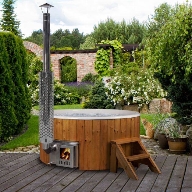 Another important note: a hot tub with an integrated wood-burning stove features a raised section, which can be a great seating area for kids or a comfortable spot to relax.