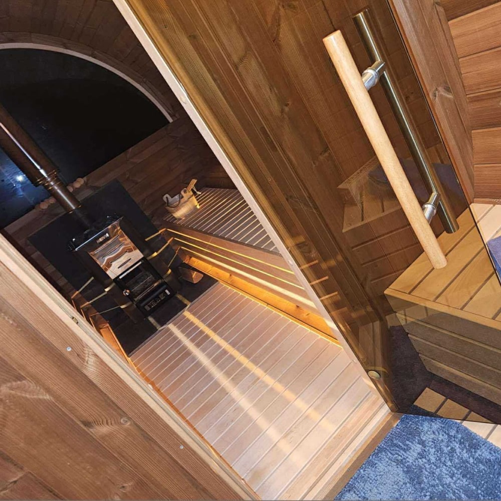 - Barrel Sauna made of ThermoWood, 4.5 m (177 in) long (upgradeable to a 5 m (196 in) model)