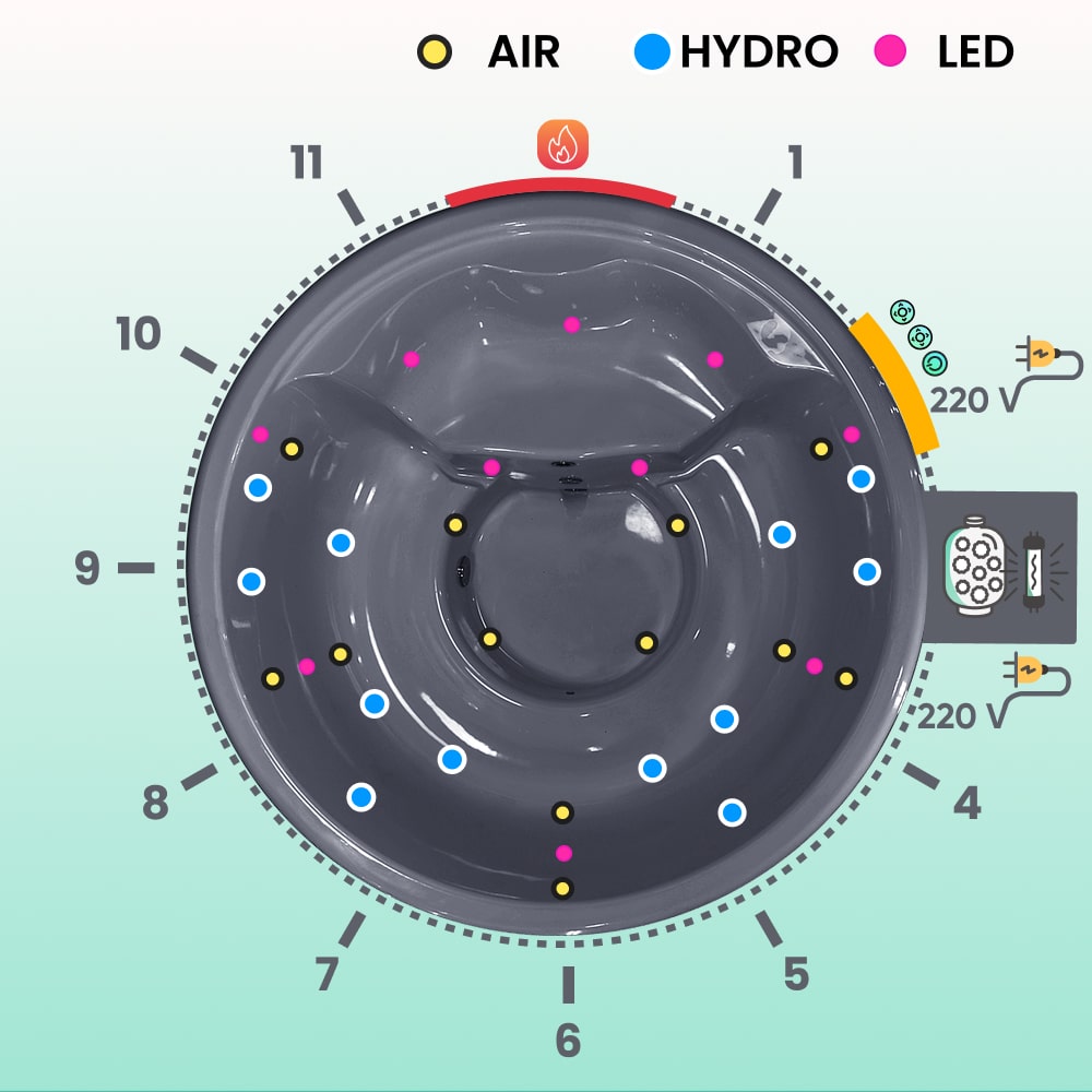 - Hydro-massage system, 12 jets, 1.1 kW (650 €)