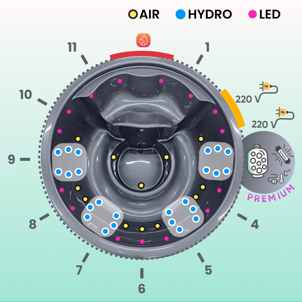 - Hydro-massage system, 24 jets, 2.2 kW (950 €)