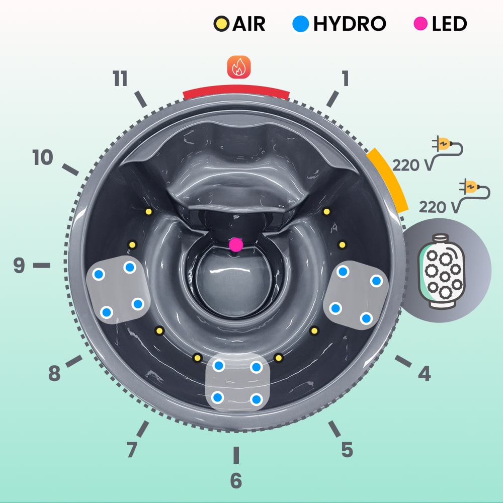 - Air jet massage system, 6 jets, 0.7 kW (275€)