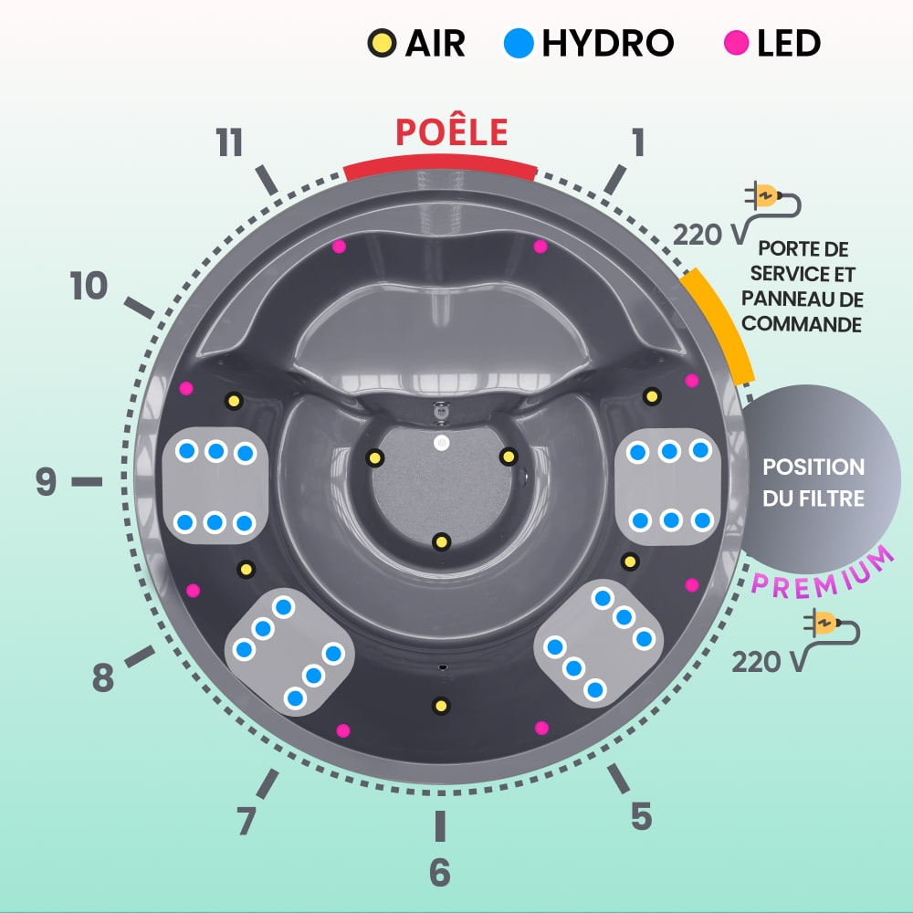- Système de massage à air, 8 jets, 0.7 kW (330 €)