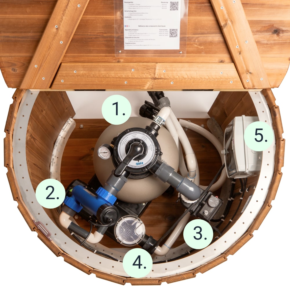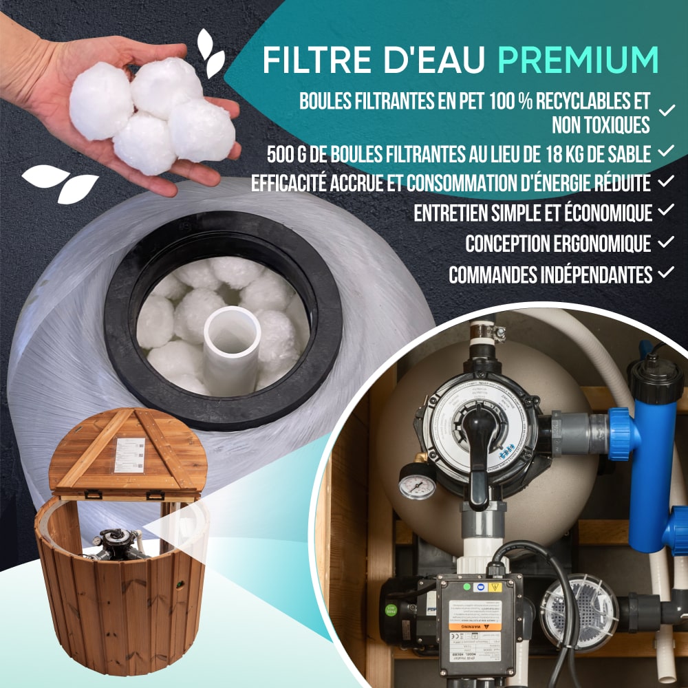 - Filtre à sable Premium: système de filtration à billes de fibre et boîte à filtre, système de stérilisation de l'eau Blue Lagoon UV-C, chauffage électrique de 3 kW (1800 €)
