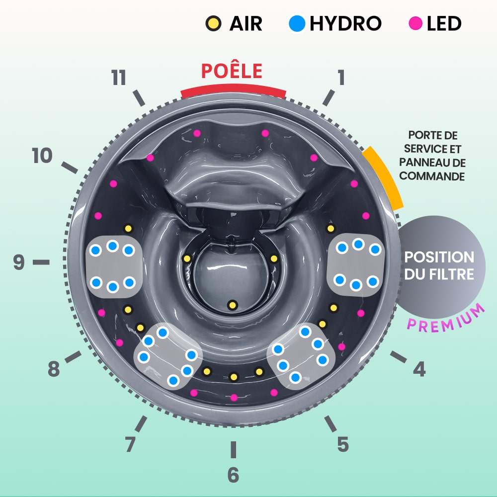 - Système de massage à air, 12 jets, 0.7 kW (550 €)