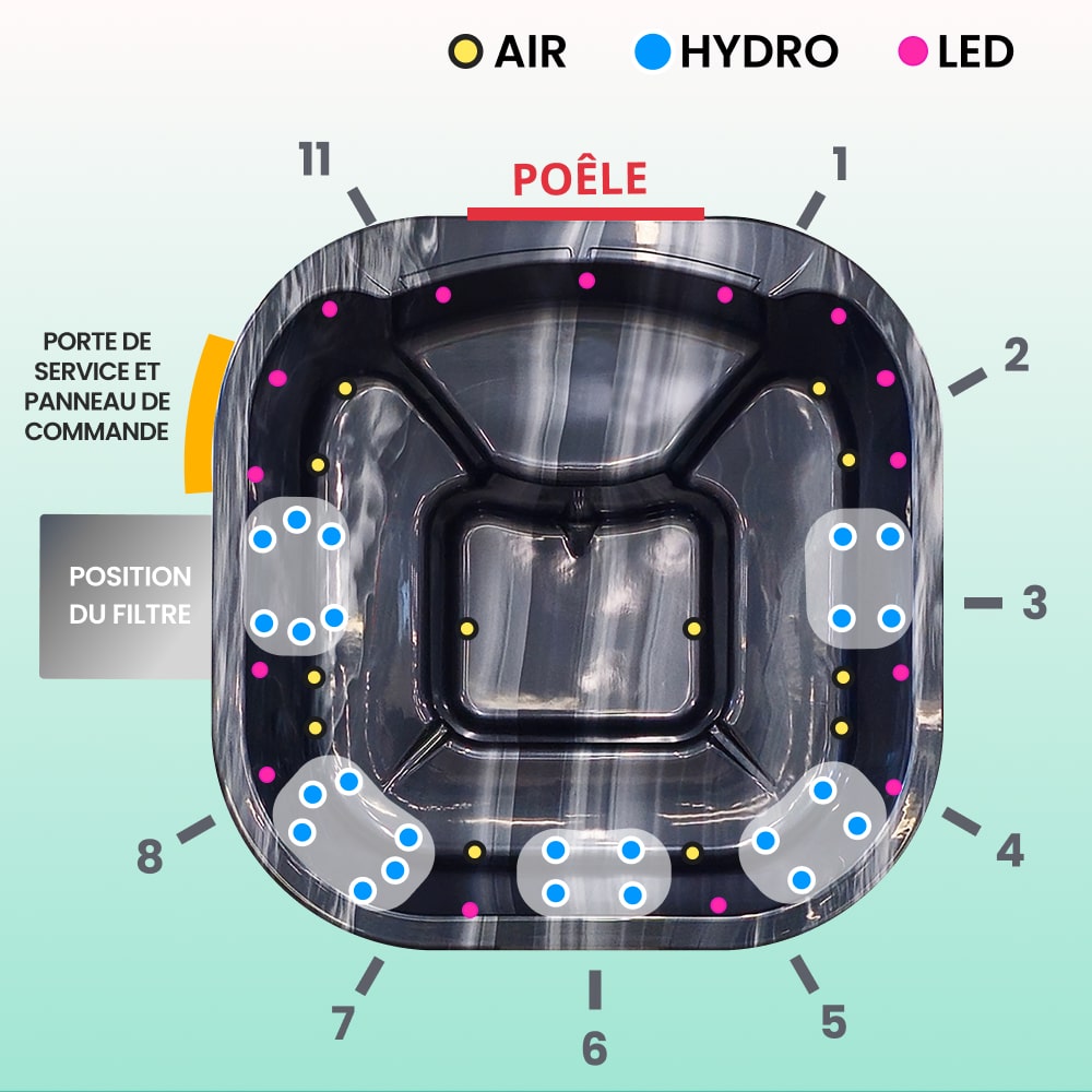 Bain nordique tout compris avec insert en acrylique noir marbre et filtration. Cette configuration comprend :