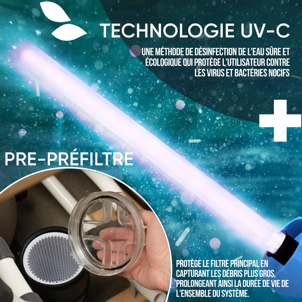 - Filtre à sable Premium: système de filtration à billes de fibre et boîte à filtre, système de stérilisation de l'eau Blue Lagoon UV-C, chauffage électrique de 3 kW (1800€)