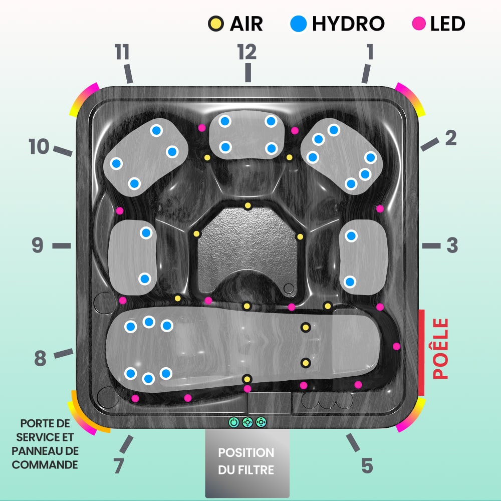 Bain nordique tout compris avec insert en acrylique noir marbre et filtration. Cette configuration comprend :